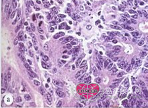 腺癌。(a)高倍镜显示中分化腺癌,癌细胞核形不规则、核深染,核仁突出及核分裂象。(b)经淋巴结活检证实有转移。