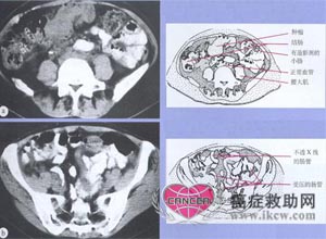 Ⅲ期卵巢癌(小肠受压)。弥漫性腹腔受累在发病时是很常见的。在CT扫描上,可表现为如(a)肠系膜肿块或如(b)因肿瘤和反应性纤维组织条索压迫小肠浆膜面。