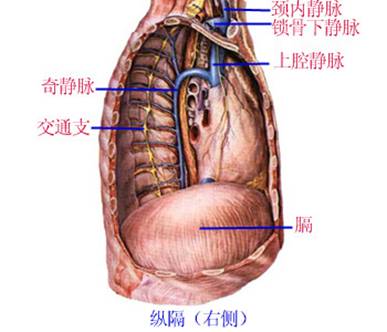 在胸腺后方有左无名静脉,斜向右,在右第1 肋软骨与胸骨柄连结处下缘与无名静脉汇合形成上腔静脉,在右第3肋软骨上缘平面进入右心房内。在上纵隔区上腔静脉上半部位于升主动脉及主动脉弓之右侧,上腔静脉下半部位于心包内。