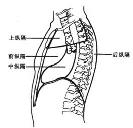纵隔分为上、前、中及后纵隔四个区,此种分法临床及放射诊断学家最常用,即在胸骨角与第4胸椎间盘间连一虚线,此线以上为上纵隔区,此区较狭窄,许多临床学家不再将其进一步划分。此虚线以下为纵隔区。下纵隔以心包为界。进一步将下纵隔分为三个区。心包前缘为(下)前纵隔区,心包后缘以后为(下)后纵隔区,心包前后缘之间则为(下)中纵隔区。